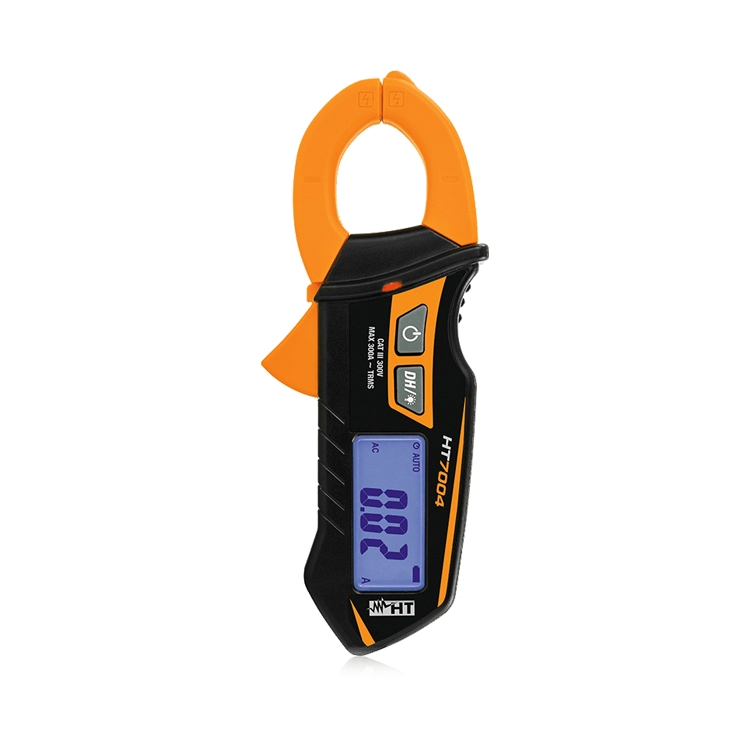 鉗形表 HT7004 能夠自動量程測量 高達 300A的真有效值 交流電流 ,符合 IEC/EN61010-1,CAT III 300V 標準。 它具有數據保持、非接觸式交流電壓測量、背光和自動關機功能,可節省內置電池。 由于其體積小巧,適用于民用和工業標準裝置中的簡單測量。
